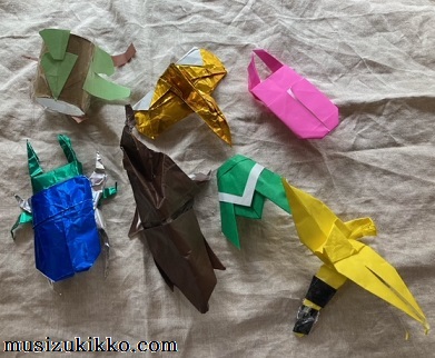息子の場合、1枚の紙から大好きな虫が何匹もできるので、折り紙遊びを覚えた頃は虫ばかり折っていました。