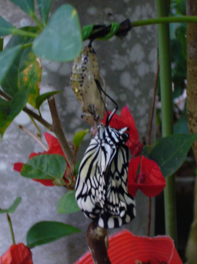 でも、由布島の蝶々園のように鈴なり状態のサナギや羽化直後の成虫を至近距離で見たことはありません