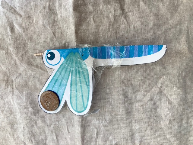 工作の課題で作ったゆらゆらトンボ(やじろべえ)。家庭では爪楊枝と10円玉だけ準備しました。